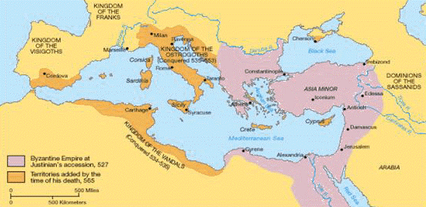 Costantinopoli o Bisanzio fu fondata da Costantino il Grande nel 330 e doveva essere la capitale dell’intero Impero di Roma. Nel 395, dopo la separazione, divenne invece la capitale dell’Impero d’Oriente. La città fu continuamente attaccata dai barbari (visigoti, unni, ostrogoti) dalla sua fondazione al 518 ma non riuscirono mai a farla cadere. Nel 518, appunto, iniziò il regno di Giustiniano che durerà fino al 565 e con Giustiniano inizierà anche la civiltà bizantina, una fioritura in latino di arti e lettere (oltre ai famosi 12 libri del Codice di Giustiniano del 534, una raccolta delle leggi ecclesiastiche, di diritto privato, di diritto penale, di diritto amministrativo e finanziario dell’Impero, con tagli, abrogazioni, aggiunte e modifiche, per rendere più efficiente, più trasparente e meno legata agli azzeccagarbugli la giustizia). Nell’Impero vi sarà un bilinguismo particolare: il latino, non compreso dalla maggioranza della popolazione, è dello Stato e di ogni manifestazione ufficiale mentre il greco è la lingua parlata da tutti, compresa la Chiesa. La carta geografica seguente riporta la massima espansione dell’Impero d’Oriente (565) che, a partire dall’area originaria in viola, comprese le aree in ocra riconquistate ai barbari proprio da Giustiniano.