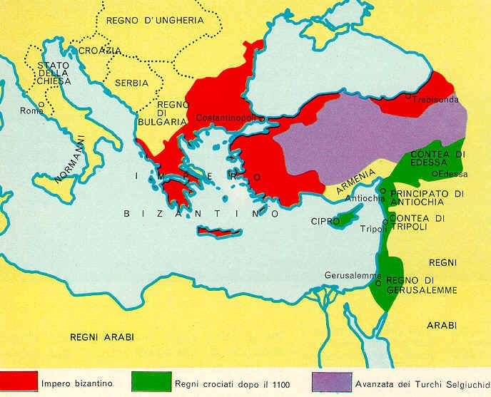 Queste popolazioni di stirpe mongola erano ancora culturalmente arretrate. Vivevano nel Turchestan e stendevano le loro propaggini occidentali fino agli Urali e al Caucaso. Venuti a contatto con gli Arabi nei pressi del lago di Aral si erano convertiti all’Islamismo, ed essendo poveri, erano penetrati alla spicciolata in mezzo ai paesi arabi in cerca di fortuna. Fortissimi e coraggiosi erano molto ricercati come guardie del corpo e truppe scelte specialmente dai califfi di Bagdad che portavano molti di loro alla propria corte. Poi avvenne qualcosa di simile a quanto avvenuto ai romani con i mercenari barbari: i Turchi divennero numerosi nell’esercito e arbitri del destino degli stati arabi nei quali servivano. I loro parenti rimasti nei paesi d’origine, attratti dalla fortuna dei propri consanguinei presso gli arabi, cominciarono ad emigrare in massa verso l’ovest, guidati dalla famiglia di Selgiuk (da cui il nome di Turchi Selgiuchidi). Attraversarono la Persia, penetrarono nella Mesopotamia e sconvolsero l’antico califfato di Bagdad nel 1055. Da qui procedettero verso il Mediterraneo e conquistarono la Siria e la Palestina, regioni allora sottomesse agli arabi dell’Egitto. Le avanguardie turche, procedendo poi verso nordovest, sconfissero l’impero d’oriente che manteneva ancora l’Asia Minore e parte dell’Armenia e della Siria. Il momento era molto difficile per i Bizantini: Bulgari e Serbi occupavano le regioni migliori della penisola balcanica; i Normanni facevano continue incursioni sulle coste dell’Epiro; dall’Armenia e dalla Siria veniva un’alluvione di fuggitivi di fronte all’invasione turca, spogliati d’ogni bene e sconvolti dal terrore. D’altra parte non era possibile attendersi aiuti dall’Occidente perché proprio in quegli anni imperversavano le controversie dogmatiche che si erano risolte nello scisma definitivo della chiesa greca dalla chiesa latina. La freddezza delle relazioni fra il papa e l’imperatore d’Oriente aveva impedito che le invocazioni d’aiuto, giunte a Roma da Costantinopoli, potessero trovare una sollecita accoglienza presso ì pontefici, ì quali sì trovavano proprio allora nel periodo più acuto della lotta delle investiture. Contro gl’invasori marciò allora, con le sole sue forze, l’imperatore Romano IV Diogene, ma nella battaglia di Manzikert (1071) fu sconfitto e fatto prigioniero. Tutta l’Asia Minore, la Siria settentrionale e l’Armenia caddero allora in mano dei Turchi; rimasero nelle mani dei Bizantini solamente alcune zone costiere, difese dalla flotta greca.