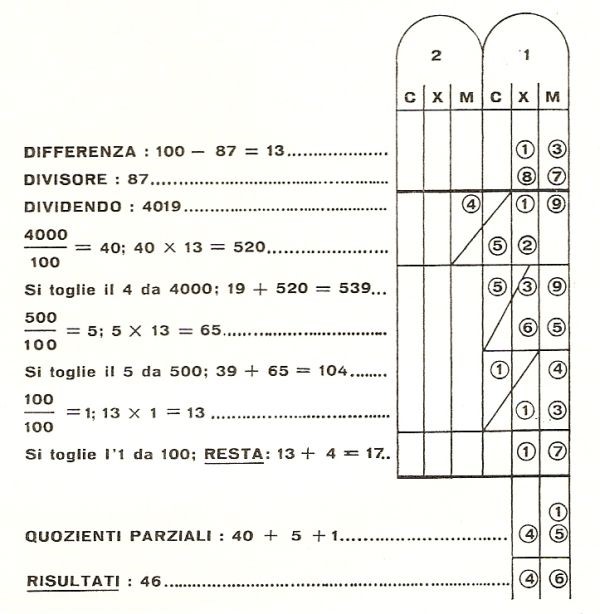 Una divisione per differenza col metodo dell’abaco di Gerberto che, in scrittura moderna ha il seguente procedimento: