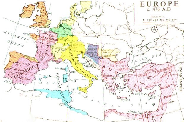E quei barbari ai quali ho accennato più su fecero alla fine crollare l’Impero d’Occidente, ed insieme ad esso quei barlumi di scienza che qua e là si mantenevano e quella tecnica (acquedotti, strade, urbanistica, edilizia, …) che invece aveva progredito di molto. Questi invasori avevano distrutto le strutture economiche, sociali e politiche distruggendo ogni possibilità materiale e morale di ricerca ma, come vedremo, a loro si deve l’introduzione di tecniche che fornirono via via la base di un modo di vita materialmente superiore a quello che si aveva nell’età classica (pantaloni al posto della toga, burro al posto dell’olio di oliva, sci, barili, botti, coltivazione della segale, dell’avena e del luppolo, staffa per cavalcare, … ). Le grandi invasioni del V secolo posero fine anche alla sola conservazione della cultura ellenistica. Nel periodo di tali invasioni, proprio per i caratteri dei popoli che entravano dal nord nel vecchio bacino del Mediterraneo, non si assiste a riproduzioni della scienza antica o a scimmiottamenti delle forme di conoscenza ellenistica ma si iniziano ad intravedere i segni di un nuovo modo di curiosità scientifica. Nel resto dell’Impero, quello di Bisanzio, pur privato della sua anima vivificatrice di Alessandria, si ebbe una vita scientifica che ancora si muoveva, anche se a rilento.