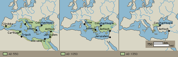 L’Impero romano d’Oriente visse per un migliaio di anni in un clima di cambio continuo di frontiere, di un instabile equilibrio politico e sociale, di frequenti lotte per motivi religiosi che si ripercuotevano continuamente nella vita pubblica. C’era Bisanzio, con l’eredità della Grecia e delle colonie dell’Asia Minore, come nucleo stabile ma l’Impero si gonfiava e si sgonfiava a seconda degli attacchi esterni e delle invasioni e delle capacità dell’imperatore di turno. Il potere era e non poteva essere che molto centralizzato per tenere insieme una miriade di popoli, costumi, religioni differenti. Il peso delle tasse e degli obblighi militari era tutto dei contadini che avevano una situazione non dissimile ai servi della gleba dell’Europa feudale. Dall’esterno vi erano pressioni continue dal Nord e dall’Est (visigoti, unni, ostrogoti, bulgari) che combattevano per conquistare le pianure del Danubio ed i Balcani. Altre pressioni venivano dalle repubbliche marinare Venezia e Genova. Vi furono poi gli attacchi religioso-commerciali delle Crociate, la quarta delle quali arrivò ad attaccare e saccheggiare la medesima Costantinopoli (1204) facendola diventare colonia di veneziani e franchi ed avendo come effetto collaterale il trasferimento di migliaia di testi e codici classici in Italia.
