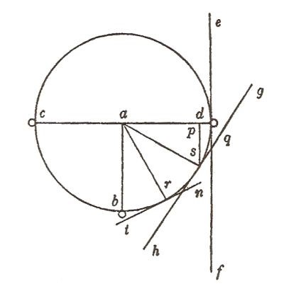 Prendendo in esame la figura qui sotto proposta, ciò significa che la discesa lungo la tangente ef avviene secondo la gravità che il mobile avrebbe nel punto d della bilancia cd; mentre il moto lungo la tangente alla circonferenza fatta nel punto s, cioè lungo la linea gh, verrà effettuato con una gravità pari a quella posseduta dal corpo se fosse sospeso in p. In tal senso, le gravità con cui il mobile percorre le inclinate ef e gh saranno nella medesima proporzione della distanza dei punti d e p dal fulcro a della bilancia.