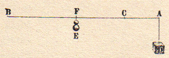 la stadera, stromento usitatissimo, col quale si pesano diverse mercanzie, sostenendole, benché gravissime, col peso d’un picciolo contrapeso, il quale volgarmente adimandano romano, proveremo, in tale operazione nient’altro farsi, che ridurre in atto pratico quel tanto che di sopra abbiamo speculato. Imperò che, se intenderemo la stadera AB, il cui sostegno, altrimenti detto trutina, sia nel punto C, fuori del quale dalla piccola distanza CA penda il grave peso D, e nell’ altra maggiore CB, che ago della stadera si adomanda, discorra inanzi ed indietro il romano E, ancorché di piccol peso in comparazione del grave D, si potrà nulla di meno discostar tanto dalla trutina C, che qual proporzione si trova tra li due, gravi D, E, tale sia tra le distanze FC, CA; ed allora si farà l’equilibrio, trovandosi pesi ineguali alternamente pendenti da distanze ad essi proporzionali.