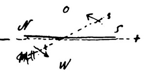 Fig. 3 – Disegno originale di Oersted del fenomeno da lui osservato (la lettera O indica l’Est)