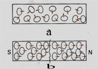 Nella figura 4, in a, sono rappresentate le molecole costituenti la materia sistemate in modo disordinato e tale da originare un materiale non magnetico mentre, in b, le molecole sono ordinate in modo tale da originare un materiale magnetico. Nella figura 5 è riportata una barra di ferro magnetizzata con le frecce disegnate che rappresentano la risultante delle correnti costituite dalla somma delle correnti elementari delle singole molecole.
