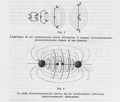 Nel 1887 H. Hertz fornisce la verifica sperimentale della teoria di Maxwell (5). Il fenomeno elettromagnetico, le onde elettromagnetiche, esiste davvero all’interno del condensatore! Per tirarlo fuori – sembra incredibile — basta «aprire» il condensatore come mostrato in figura 3 (nella quale le linee tratteggiate rappresentano il campo elettrico esistente tra le armature del condensatore, campo che cambia verso con la frequenza del circuito di alimentazione). Completando poi l’ultimo disegno di figura 3 con il campo magnetico perpendicolare al campo elettrico, si ottiene il campo elettromagnetico risultante dal fenomeno (fig. 4), campo che si propaga dal punto in cui è generato nello spazio circostante. In questo modo disponiamo di un sistema che permette la propagazione