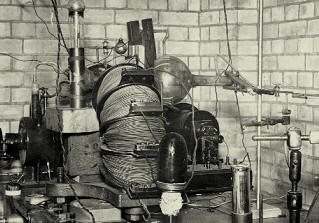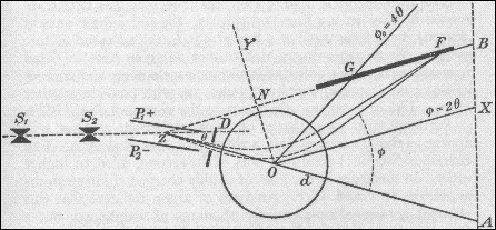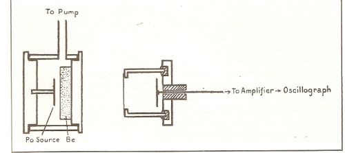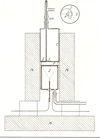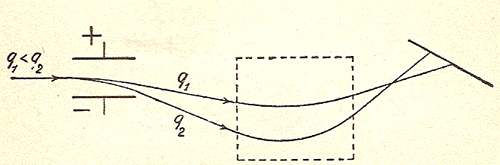 Apparato utilizzato da Rutherford per mostrare che anche le particelle α subivano deviazioni se i campi magnetici erano sufficientemente intensi. Le radiazioni provenienti da un sottile strato di radio passavano attraverso il sistema di fenditure realizzato disponendo, parallelamente l’una all’altra, un determinato numero di lastre d’ottone. Passando poi attraverso un sottile foglio di alluminio (spesso 0,00034 cm) entravano nella camera di ionizzazione V. La ionizzazione prodotta era misurata determinando la velocità di scarica dell’elettroscopio B. Il flusso di idrogeno, che dal recipiente V passava attraverso il foglio di alluminio poroso nel recipiente G, aveva un duplice scopo: per un verso serviva a portar via l’emanazione del radio, per l’altro verso serviva ad aumentare la corrente di ionizzazione dovuta ai raggi α e a diminuire quella dovuta ai raggi β e γ. Ciò era dovuto al fatto che i raggi α erano poco assorbiti dall’idrogeno rispetto all’aria, mentre i raggi β e γ producevano, in idrogeno, una quantità molto minore di ioni rispetto a quella prodotta in aria. L’esperienza, nelle sue linee generali, consisteva nel misurare la corrente di ionizzazione con e senza l’applicazione di un forte campo magnetico, perpendicolare al piano del disegno e parallelo al piano delle fenditure. La valutazione degli effetti di ionizzazione, non determinati dai raggi α, era eseguita ripetendo la stessa esperienza, quando la sorgente radioattiva era ricoperta da un foglio di mica in modo da assorbire tutte le radiazioni α.
