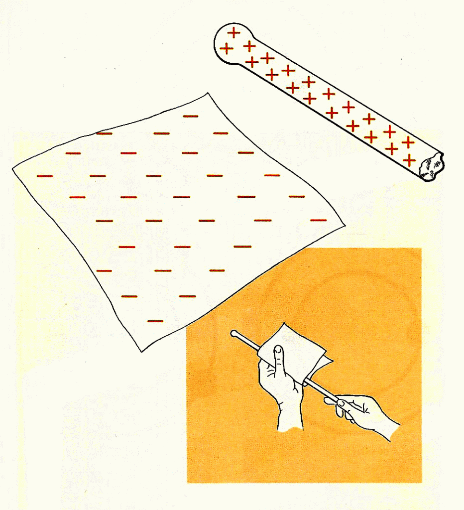 Strofinio. Se strofiniamo un oggetto con un panno diciamo che quell’oggetto si elettrizza, acquista cioè quelle particolari proprietà che gli permettono di attrarre piccoli oggetti, come palline di carta, pagliuzze, … Questa descrizione è del tutto incompleta. E’ molto più corretto dire che l’oggetto si elettrizza insieme al panno che lo strofina e, fatto importante, si elettrizzano con segni opposti. Se l’oggetto si elettrizza positivamente, il panno si elettrizza negativamente.