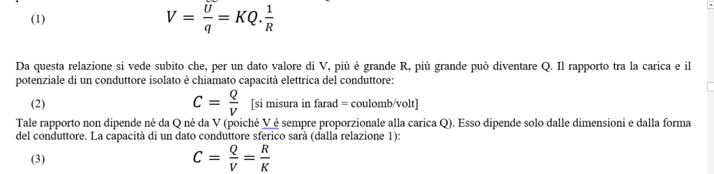 Tale rapporto non dipende né da Q né da V (poiché V è sempre proporzionale alla carica Q). Esso dipende solo dalle dimensioni e dalla forma del conduttore. La capacità di un dato conduttore sferico sarà (dalla relazione 1):