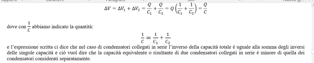 e l’espressione scritta ci dice che nel caso di condensatori collegati in serie l’inverso della capacità totale è uguale alla somma degli inversi delle singole capacità e ciò vuol dire che la capacità equivalente o risultante di due condensatori collegati in serie è minore di quella dei condensatori considerati separatamente.