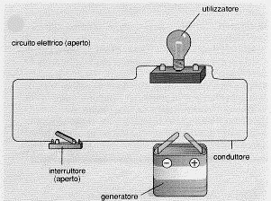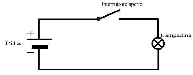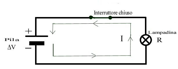 una pila come Volta l’ha pensata che alimenta un utilizzatore, in questo caso una lampadina. Ora, nella figura seguente, aggiungo degli elementi modernizzando il tutto. La pila è una pila che si trova comunemente in commercio; un cavetto elettrico (conduttore) collega i due poli della pila (la sua differenza di potenziale) ad un utilizzatore o resistenza (in questo caso una lampadina) attraverso u normale interruttore o tasto.