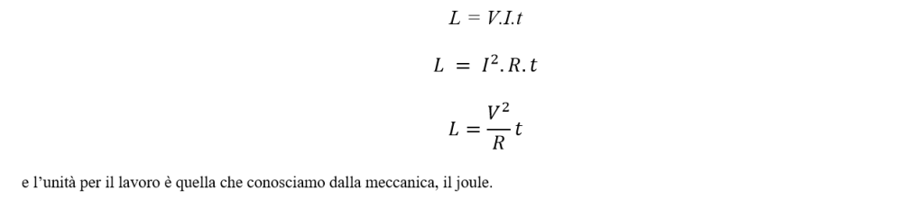 Arrivati a questo punto è facile fornire alcune relazioni che ci serviranno nel seguito. Poiché W = L/t, si ricava facilmente che il lavoro è dato da L = W.t, da cui, per quanto appena trovato, il lavoro in elettricità è dato da: