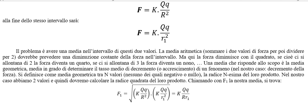 Il problema è avere una media nell’intervallo di questi due valori. La media aritmetica (sommare i due valori di forza per poi dividere per 2) dovrebbe prevedere una diminuzione costante della forza nell’intervallo. Ma qui la forza diminuisce con il quadrato, se cioè ci si allontana di 2 la forza diventa un quarto, se ci si allontana di 3 la forza diventa un nono, … Una media che risponde allo scopo è la media geometrica, media in grado di determinare il tasso medio di decremento (o accrescimento) di un fenomeno (nel nostro caso: decremento della forza). Si definisce come media geometrica tra N valori (nessuno dei quali negativo o nullo), la radice N-esima del loro prodotto. Nel nostro caso abbiamo 2 valori e quindi dovremo calcolare la radice quadrata del loro prodotto. Chiamando con F1 la nostra media, si trova: