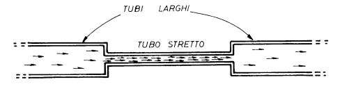 Ora, evidentemente, non è più possibile pensare che indefinitamente gli elettroni « passino » da sinistra a destra come avveniva nel caso illustrato in figura 20 (gas di elettroni senza nuclei). Poiché ad ogni passaggio da sinistra a destra corrisponde un acquisto di energia (al passaggio ad un livello energetico più elevato) è chiaro che, data la struttura a bande, questo processo debba ad un certo punto interrompersi (quando gli elettroni sono arrivati ad occupare il livello energetico più elevato che compete ad una banda di energia permessa).