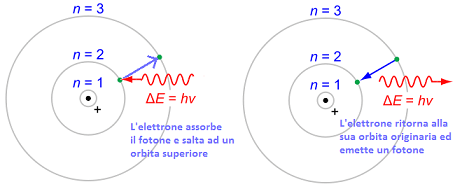 II secondo postulato riconosce che l’elettrone orbitale non può emettere alcuna energia a meno che non cambi orbita (cioè livello energetico); questo passaggio non può avvenire, quindi, gradualmente, ma si ha un vero e proprio salto energetico (qui si scavalcano le obiezioni a Rutherford con una semplice affermazione, piena però di conseguenze). Quando, per un qualche motivo, un elettrone salta da una orbita ad energia più alta (livello energetico iniziale: i) ad una energia più bassa (livello energetico finale: f), la sua perdita di energia è emessa sotto forma di quanto di luce (oggi meglio conosciuto come fotone). Si ha così: ΔE = Ei – Ef = hν, dove Ei è l’energia corrispondente all’orbita ad energia più alta, Ef quella corrispondente all’orbita ad energia più bassa ed hν è l’energia che corrisponde al fotone (è il prodotto tra una costante h e la frequenza ν che corrisponde a quel fotone). La relazione scritta significa che un elettrone nel passare da una certa orbita ad una ad energia più bassa perde energia, e questa perdita di energia (per la legge di conservazione) la si ritrova sotto forma di emissione di radiazione (emissione di un quanto di radiazione). Nel caso il salto avvenga in senso contrario a quello descritto fin qui si ha assorbimento di un quanto di radiazione hν dall’esterno.
