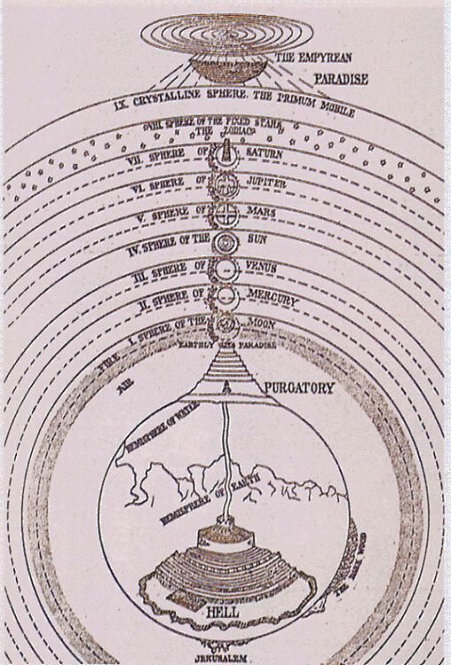 Hermes affermerà varie cose tra cui il fatto che l’elemento che unisce l’uomo a Dio è l’intelletto. Ma l’uomo ha la doppia natura di cui si diceva perché Dio creò un altro Dio (secondo Lattanzio questo era Gesù) e questi era tanto bello che Dio si innamorò di esso. Non ebbe altro rimedio che crearne ancora perché questo Dio aveva bisogno di qualcuno che potesse ammirare le meraviglie del creato. In questo modo venne fuori l’uomo che doveva avere natura spirituale per mettersi in relazione con la divinità ma anche natura materiale per potersi mettere in relazione con il mondo stesso. Colui che dirigeva tutto questo sistema era Giove (questo è un evidente elemento che dice molto sulla sistemazione cronologica di Hermes) sistemato tra cielo e terra. E qui sembra che con Giove ci si riferisca al pianeta poiché poi i riferimenti vanno al Sole ed agli altri pianeti. Quindi ci troviamo immediatamente immersi in una struttura astrologica che lega gli astri alla divinità. È il Sole che dà vita a tutto e “questo Sole, per sua natura, non può che trovarsi al centro del sistema del mondo”, dispensando vita, luce e rappresentando nel modo più imponente la divinità (e la stessa luce non è qualcosa che si differenzia dalla divinità medesima). Vi è quindi una gerarchia nel mondo e tale gerarchia prevede una struttura che è la base dell’Oroscopo che è un qualcosa legato alla divinità. Poiché la rotazione della volta celeste è di 360 gradi, ogni 10 gradi vi è un Dio (anche qui c’è una influenza numerologica: il 10 rappresenta la potente tetrakis davanti alla quale occorre solo inchinarsi) e così vi sono 36 dei nello Zodiaco che rappresentano i decani (nome che deriva da quel 10 che ciascun dio rappresenta). Questa struttura è situata nella sfera delle stelle fisse e questi dei hanno ivi dimora. Più in basso vi sono i sette cieli dei vari pianeti (più Luna e Sole) che sono strettamente legati a Fortuna e Destino. È l’etere che trasmette “informazioni” (anticipo qui che per Newton, che vive immerso in questa cultura, lo spazio è il ‘sensorium Dei’). In fondo alla scala, come anticipato, vi è l’uomo sulla Terra (sotto di essa la demonologia). Osservo a parte che questa struttura è stata stupendamente resa evidente da Dante nella , Divina Commedia, vediFig. 0, tratta da M. Caetani – La Materia della Divina Commedia, 1855).