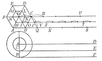 Galileo fornisce una soluzione che non soddisferà i suoi contemporanei e che darà molto da discutere. Egli, nel suo ragionamento, fa ruotare due esagoni equilateri ed equiangoli concentrici per avere dei punti fissi cui riferirsi(4). Con questo sistema scopre che l’esagono più piccolo deve compiere lungo la tangente su cui si muove dei piccoli salti equivalenti alla differenza tra il lato BC dell’esagono più grande ed il suo IK. I salti sono rappresentati in figura dagli archetti e più aumenta il numero dei lati dei poligoni che consideriamo più questi archetti sono piccoli. A questo punto il discorso diventa, almeno apparentemente, facile perché Salviati osserva che i cerchi son poligoni di lati infiniti ai quali si applica il medesimo discorso con in più il fatto che gli archetti sono spariti essendo sostituiti da infiniti vacui di modo che la linea descritta dalc erchio minore è costituita da da innumerevoli spazi vuoti alternati con innumerevoli spazi pieni (ad ogni archetto che rappresenta un salto del poligono minore rispetto al maggiore, salti che sommati tra loro annullano la differenza tra la linea descritta dal poligono minore rispetto al maggiore, nel caso dei cerchi dobbiamo considerare un vacuo del cerchio minore rispetto al maggiore di modo che la linea del cerchio minore risulta uguale a quella del maggiore perché è punteggiata di vacui inesistenti nella linea descritta dal maggiore). Salviati deve però spiegare meglio e si fa aiutare da una domanda di Sagredo per entrare in maggiori dettagli che lo portino dal paradosso alla questione dei piccoli spazi vuoti restata in sospeso: