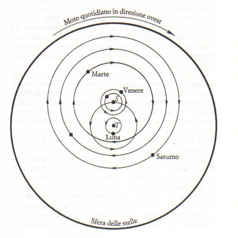 – L’asse della sfera che porta il pianeta è fissato all’interno di un’altra sfera rotante, il cui asse è attaccato ad una terza sfera e così via. Postulando un numero sufficiente di sfere, disponendo gli assi ad angoli appropriati e variando le velocità di rotazione si riesce a rappresentare con buona approssimazione il moto dei pianeti, del Sole e delle stelle.