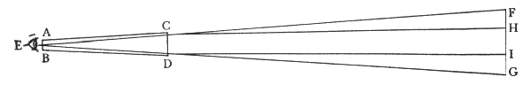 L’occhio di colui che guarda sia E. I raggi, finché non ci sono nel cannocchiale le lenti, giungono all’oggetto FG secondo le linee rette ECF, EDG; ma, poste le lenti, giungeranno secondo le linee rifratte ECH, EDI: infatti sono raccostati, e quelli che prima, liberi, si dirigevano all’oggetto FG, ne comprenderanno solo la parte HI. Trovato poi il rapporto della distanza EH alla linea HI, con la tavola dei seni si troverà l’ampiezza dell’angolo formato nell’occhio dall’oggetto HI, che vedremo contenere soltanto qualche minuto. Se poi adatteremo alla lente CD sottili lamine, perforate alcune con fori maggiori altre con fori minori, sovrapponendo or questa or quella secondo sarà necessario, formeremo a piacere angoli diversi, sottendenti più o meno minuti, con l’aiuto dei quali potremo facilmente misurare gli intervalli fra le Stelle, distanti l’una dall’altra di qualche minuto, senza errore nemmeno di uno o due minuti. Ma per il momento basti aver toccato di questi argomenti così lievemente, e quasi averne gustato a fior di labbra, poiché in altra occasione esporremo intera la teoria di questo strumento.