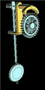 La massa (il cilindro rosso in basso) è appesa ad una corda e, man mano che scende, fa ruotare il cilindro sovrapposto (in colore celeste) a cui è connessa una ruota dentata. Mediante gli ingranaggi sovrapposti, il moto viene trasferito alla piccola ruota dentata che si trova più in alto (in celeste). Su questa piccola ruota agisce il meccanismo dello scappamento ad ancora (in giallo) che fa muovere ritmicamente gli ingranaggi. In assenza di esso vi sarebbe una rotazione continua e veloce di tutte le ruote dentate fino a che la massa non arriva al suolo. Quell’ancora mossa dal pendolo che si trova a sinistra, oscilla con il pendolo in modo da bloccare con i suoi due denti per un breve istante (regolato dal periodo del pendolo) la piccola ruota celeste, una volta da un lato ed una da un altro come mostrato nella figura seguente.