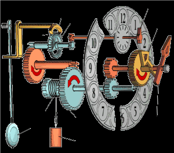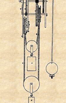 Schema dell’orologio a pendolo ed a gravità di Huygens, da http://www.britannica.com/clockworks/pendulum.html