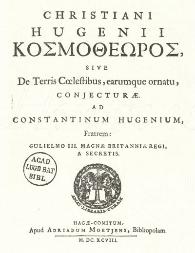 L’ultima opera di Huygens fu Cosmotheoros, sive de terris coelestibus, earumque ornatu, conjecturae (divisa in due libri e pubblicata postuma nel 1698, a tre anni dalla morte di Huygens), un lavoro in cui la sua fantasia si sposa con le sue convinzioni a proposito di un universo in cui devono esistere diversi sistemi solari ciascuno dei quali deve avere pianeti, molti dei quali abitati ma da vite intelligenti che non possono che avere caratteristiche antropomorfe. Già vi era stata un’opera del medesimo contenuto che aveva in qualche modo stimolato Huygens. Si tratta di Entretiens sur la pluralité des mondes di M. de Fontenelle, pubblicato nel 1686. E’ interessante osservare che egli, che rimane pur sempre un creazionista, ribalta le tesi della Chiesa cattolica, quella che anche per questo, cento anni prima, aveva bruciato Giordano Bruno. E, proprio in apertura di questo suo scritto, egli richiama proprio Bruno (insieme al cardinal di Cusa), Kepler (che aveva scritto il Songe, pubblicato postumo nel 1634, opera “fantascientifica” che racconta la vita sulla Luna) ed allo stesso Fontenelle (ingegnoso autore francese). Egli sostiene che Dio è così grande e giusto che non può aver riservato alla sola Terra, in tutto l’universo, la sua grazia. Queste tesi potevano solo essere sviluppate molto lontani da Roma.