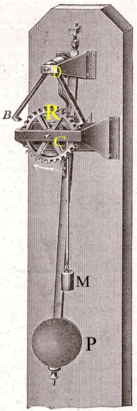 La massa M, cadendo, muove la ruota dentata R tramite una corda che tende a svolgersi da un rullo. Su tale ruota agisce un sistema di distribuzione (scappamento) imperniato in D e mosso dal pendolo P. Lo scappamento ABD, che serve a trasformare il moto alternato del pendolo in moto circolare e a fornire energia, fa si che quando il pendolo si trovi ad una estremità del suo percorso venga spinto nella direzione opposta, e contemporaneamente la ruota dentata avanzi di uno scatto. Una volta che il pendolo è giunto all’estremo opposto della traiettoria il processo si inverte e la ruota avanza di un altro scatto.