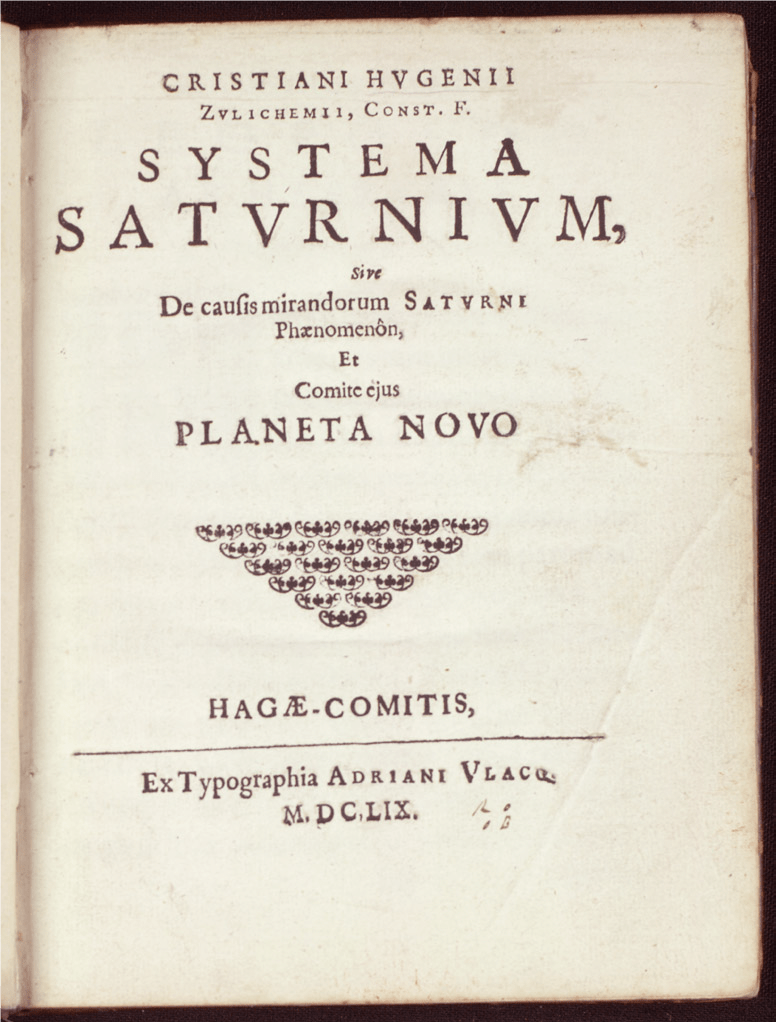 scoperte, utilizzò anagrammi in latino composti di varie lettere che per loro trasposizione formavano la frase nascosta e li incideva sull’oculare del telescopio. L’anagramma per l’anello di Saturno era: aaaaaaa ccccc d eeeee g h iiiiiii llll mm nnnnnnnnn oooo pp q rr s ttttt uuuuu che sta per Annulo cingitur tenui, plano, numquam cohaerente ad eplicticam inclinato (“È circondato da un sottile anello piatto, che non lo tocca mai e che è inclinato rispetto all’eclittica”), mentre quello per la scoperta di Titano era: aaaaa b ccc ddd eee h iiii l mm nn ooo q rrrrr ssssss ttt uuuuuuuuu x che sta per Saturno luna sua circumducitur diebus sexdecim, horas quatuor (“Saturno è accompagnato da una luna che gli gira intorno in 16 giorni e quattro ore”). Per la scoperta di Titano, Huygens ricevette le felicitazioni del grande astronomo ligure, Gian Domenico Cassini (che per la fama conquistatasi con le sue osservazioni a Bologna, nel 1669, venne chiamato a Parigi dal Re Sole, Luigi XIV, presso l’Observatoire Royal, appena istituito).