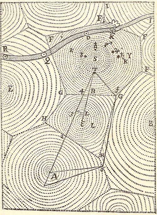 Poniamo, per esempio (vedi figura precedente), che i punti S.E.e.A siano i centri di cui parlo; e che tutta la materia inclusa nello spazio F.G.G.F. sia un cielo ruotante attorno al Sole indicato con S; e che tutta quella dello spazio H.G.G.H. sia un altro cielo ruotante intorno alla stella indicata con E, e così via: in modo che vi siano tanti cieli diversi quante sono le stelle; ma, essendo indefinito il numero delle stelle, altrettanto diciamo del numero dei cieli; e che il firmamento altro non sia se non la superficie priva di spessore che separa tutti i cieli gli uni dagli altri [Monde; 14; 75]
