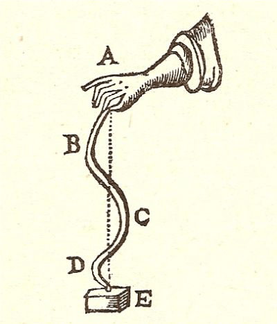 […] il sasso che ruota in una fionda secondo il circolo AB (vedi figura precedente), quando si trova in A, tende verso C, se si considera solo la sua agitazione, prescindendo dal resto; tende circolarmente da A verso B, se si considera il suo movimento in quanto regolato e determinato dalla lunghezza della corda che lo trattiene; infine, il medesimo sasso tende verso E se, prescindendo da quella parte della sua agitazione il cui effetto non è impedito, si oppone l’altra parte alla resistenza che la fionda le offre di continuo.