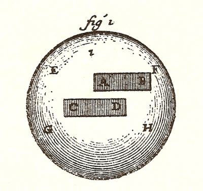 spiccate analogie con i suoi vortici e da lì il fenomeno divenne centrale nei suoi interesse. Fu allora che studiò il De Magnete ma non seguendo le orme di Gilbert perché, come suo costume, Descartes non intraprese un’indagine metodica dei fenomei magnetici. Si costruì soltanto un magnete sferico ad imitazione della «terrella» di Gilbert e vide che la limatura di ferro si disponeva ai poli formando dei piccoli tubi curvi. Descartes considerò questi tubi come veri tubi attraverso i quali la materia si spostava. Il problema era capire quale tipo di materia e, dopo varie riflessioni, Descartes optò per particelle del primo elemento (quelle eteree che costituiscono il fuoco e la materia celeste). Quei tubi storti erano quelli che eccitavano la fantasia di Descartes ed egli per questo pensò al primo elemento perché quello era in grado di prendere la forma del foro nel quale si situava. Il modo di intendere la cosa è spiegato da Shea che riporta uno studio e le due figure seguenti da un lavoro di Heilbron. Le particelle sferiche del secondo elemento lasciano degli spazi tra loro, anche se compattate e le possibilità di tali spazi sono quelle mostrate nelle figure: