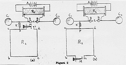 Egli montò quindi l’esperienza così com’è schematicamente mostrato in figura 2a, nella quale: R1 rappresenta un rocchetto d’induzione alimentato dall’accumulatore A; B è un circuito di scarica nel quale le sfere C1 e C2 sono due conduttori metallici ivi sistemate per aumentare la capacità dei cavi; K ed R2 costituiscono il circuito secondario su cui viene indotta la corrente generata da R1; M rappresenta uno spinterometro, regolabile mediante una vite micrometrica, sul quale si producono le scintille di scarica. Così scriveva Hertz nella sua memoria del 1887, Sulle oscillazioni elettriche rapidissime, nella quale descriveva i risultati dei suoi primi lavori sperimentali (15): “L’esperienza iniziale è semplice. Un filo di rame piegato secondo un rettangolo costituisce un circuito secondario; esso è tagliato a metà di uno dei due lati da un micrometro a scintille M. Un altro filo conduttore lo collega per uno dei suoi punti P al circuito di scarica [B] di una bobina d’induzione [R1], circuito molto aperto formato da due rami paralleli, posti testa a testa, che portano alle loro estremità delle sfere [C1 e C2] che costituiscono delle capacità e separato da un intervallo regolabile [h] tra cui scoccano le scintille primarie. Quando il punto di giunzione P è posto asimmetricamente rispetto al micrometro M, ogni scintilla primaria genera una scintilla secondaria [fig. 2a]. Ma se esso è al centro del lato opposto al rettangolo [fig. 2b], se la simmetria dei due rami è completa, la scintilla secondaria scompare o quasi: si è al ‘punto di indifferenza’.”