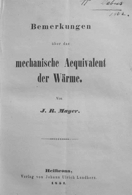 Benché fosse molto abbattuto si mise di nuovo al lavoro per migliorare il suo lavoro, per perfezionarlo, per aggiungervi altri argomenti. In particolare un problema lo assillava: avendo individuato nel Sole l’origine delle energie animali, occorreva chiudere l’argomento con cosa fornisse energia al Sole per dare il suo calore alla Terra. Iniziò con il pensare a straordinarie energie cosmiche ma abbandonò subito l’idea. Si indirizzò allora sulle energie cinetiche delle masse che costituiscono il cosmo, energie che in qualche modo il Sole raccoglieva. Si servì anche di una formula che fornisce la velocità che possiede un corpo che cade dall’infinito verso un corpo che lo attrae ma se così fosse stato, allora la Terra avrebbe dovuto perdere la sua energia cinetica diminuendo continuamente la sua velocità intorno al Sole. Non credo sia il caso di andare oltre perché non esce nulla di buono da questi discorsi che mostrano una grande fantasia, un impegno ammirevole ma che non potevano sfociare in nulla. Queste lavoro fu pubblicato ad Heilbronn nel 1848 sotto il titolo Beiträge zur Dynamik des Himmels in populärer Durstellung (Contributo alla dinamica del cielo in forma popolare), proprio nell’anno in cui si ebbe una ventata rivoluzionaria che lo spaventò (egli era un conservatore) ed in cui si aprì la polemica con Joule sulla priorità della scoperta dell’equivalenza tra calore e lavoro, come vedremo più avanti. Qui basti dire che la polemica fu durissima soprattutto perché, anche in Germania, pochissimi conoscevano i suoi lavori, misconosciuti a maggior ragione all’estero. Nessuno quindi, se ci riferiamo a presone di prestigio, assunse le sue difese. Attacchi durissimi vennero anche dalla stampa dove un tal dottor Otto Seyffer lo insultò affermando che le cose che aveva scritto erano solo parole parole non sostenute da esperienze condotte con i metodi classici della fisica. Sull’Augsburger Allgemeinen Zeitung, arrivò ad affermare che il vero fisico era Faraday mentre lui non era altro che un fantasista. A Mayer non fu data la possibilità di rispondere su quel giornale (scrisse lettere e fece personali appelli all’editore ma invano) e questo avvenimento lo abbatté profondamente anche perché nella sua piccola Heilbronn iniziarono a considerarlo un megalomane che si attribuiva meriti altrui, ma non lo fece rinunciare. Si mise a lavorare con lena ancora intorno alle sue idee perfezionandole e chiarendole al massimo grado fino a presentarle in una forma classica priva di ogni possibile difetto. Il lavoro fu pubblicato nel 1851 ad Heilbronn con il titolo Bemerkungen uber das mecanische Aequivalent der Wärme (Osservazioni sull’Equivalente meccanico del Calore).