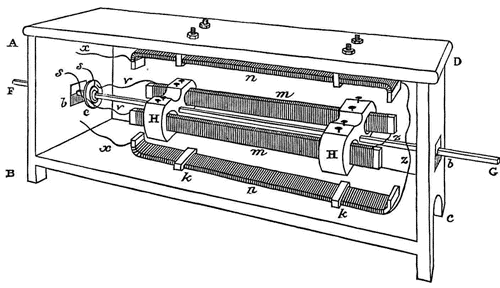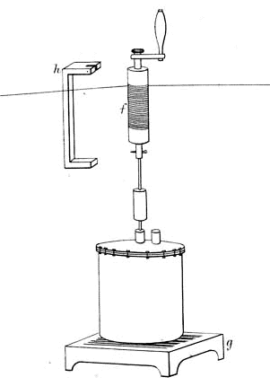 Per fare ciò confrontò i risultati dell’esperienza che aveva proposto nella prima parte della memoria con quella che proponeva ora e che consisteva nel cambiare il meccanismo di rotazione dell’elettromagnete all’interno del tubo di vetro con un sistema meccanico che permettesse di misurare il lavoro fatto con notevole precisione in sostituzione della manovella. Due cordicelle sottili, avvolte intorno ad un cilindro e passanti su due pulegge, erano in grado di far ruotare il medesimo cilindro mediante la caduta di pesi sospesi alle loro estremità. Questo era il sistema che egli utilizzò per sostituire la manovella della precedente esperienza (figura seguente).