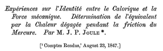 per ricavare l’equivalente meccanico del calore. Altra breve nota, di appena 3 pagine, comparirà sui Comptes Rendus de l’Académie des Sciences di Parigi (Expériences sur l’Identité entre le Calorique et la Force Mécanique, 1847) e, fatto importante, tale memoria era stata richiesta a Joule da Biot, Pouillet e Regnault, come prova del grande interesse francese per questa scoperta, da confrontare con il quasi completo disinteresse inglese che, noblesse oblige, usava pensare che non poteva venir fuori nulla di buono dalla provincia.
