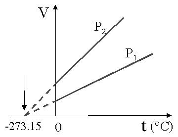 Questo ragionamento di Thomson era basato sulla legge di Gay-Lussac (1802) che si rifaceva ad un lavoro di Charles del 1787 (motivo per il quale la legge è anche nota come legge di Charles), secondo la quale, a pressione costante, il volume di un gas varia linearmente con la temperatura. Rappresentando graficamente la legge, si trova:
