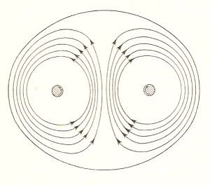 Il profilo convesso di un vortice doppio costituito da due vortici retti, paralleli, infinitamente lunghi e dotati di rotazioni uguali di senso opposto. In figura sono anche rappresentate le linee del moto del fluido trasportato dal vortice.