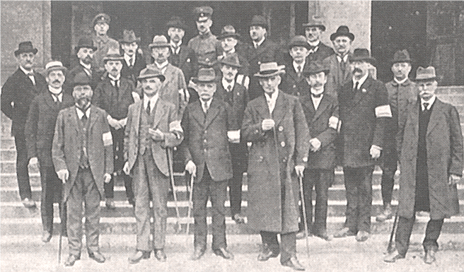Wien in prima fila ed al centro in una riunione del 1919 subito dopo la Prima Guerra Mondiale. Wien fu tra i firmatari del “Manifesto dei 93“, firmato appunto da 93 grandi intellettuali tedeschi [http://fr.wikipedia.org/wiki/Manifeste_des_93] e dal titolo Aufruf an die Kulturwelt tradotto poi in francese come Appel des Intellectuels allemands aux Nations civilisées. Tale manifesto fu redatto per rivolgersi a tutte le nazioni europee che, a detta dei firmatari, avevano falsificato la storia nel parlare delle atrocità tedesche nell’invasione del Belgio e nella battaglia della Marna del 1914. Invocando Kant, Goethe e Beethoven, si trattava del sostegno al Kaiser Guglielmo II, all’impero tedesco ed al suo esercito. Altri firmatari noti furono: Nernst, Ostwald, Lenard, Klein, Planck, Roentgen, Wundt. Tristi presagi per il futuro, con alcuni di questi firmatari, tra cui Planck, che si ravvederanno in seguito.