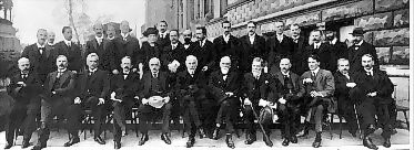 Congresso Solvay del 1913 a Bruxelles. (Da sinistra in piedi ultima fila) Verschaffelt, von Laue, Rubens, Goldschmidt, Herzen, Lindemann, de Broglie, Pope, Gruneisen, (ancora in piedi, fila intermedia) Hasenohrl, Jeans, W. L. Bragg, Marie Curie, Sommerfeld, Albert Einstein, Knudsen, Langevin (ultimo a destra, in piedi), (e, seduti da sinistra) Nernst, Rutherford, Wien, J.J. Thomson, Warburg, Lorentz, Brillouin, Barlow, Kamerlingh Onnes, Wood, Gouy, Weiss.