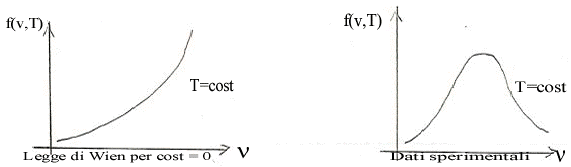 (16) La legge dello spostamento di Wien è in accordo con i dati sperimentali come si trovò a posteriori (nel 1895 fu Paschen a dimostrarne la correttezza). Ma, a priori, è impossibile assegnare un valore alla constante che figura nella (24). Ciò vuol dire che non è escluso che tale constante sia nulla, fatto dal quale discenderebbe che un massimo di emissione si dovrebbe avere a qualunque temperatura in corrispondenza di λm = 0. Quindi la termodinamica non esclude che la legge di emissione sia rappresentata da una funzione f(ν,T) sempre crescente al crescere della frequenza ν (anche se l’esperienza dice esattamente il contrario). In definitiva i risultati di Wien, pur non essendo in contrasto con l’esperienza, non risolvono il problema del corpo nero in modo univoco: è indeterminata la constante ed è indeterminata la funzione g(λT).