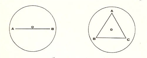 […] è necessario considerare più attentamente il modo in cui i corpuscoli [gli elettroni] si dispongono nell’atomo. Cominceremo col caso in cui i corpuscoli sono a riposo. Si suppone che i corpuscoli si trovino in una sfera di elettrificazione positiva che produce una forza attrattiva radiale su ogni corpuscolo proporzionale alla sua distanza dal centro della sfera, e il problema è di disporre i corpuscoli nella sfera in modo che essi siano in equilibrio sotto l’azione di questa attrazione e delle loro mutue repulsioni. Se vi sono solo due corpuscoli, A B, si può vedere subito che essi saranno in equilibrio se disposti in modo che A B e il centro della sfera siano sulla stessa linea retta e OA = OB = ½ del raggio della sfera.