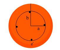 Finalmente nel 1904, J. J. Thomson pubblicò una memoria nella quale mise insieme le sue idee sull’argomento proponendo un modello atomico definito(13). Dopo molte pagine di conti per mostrare la stabilità di un tale modello atomico, J. J. Thomson passava a descrivere un modello in cui n particelle elettrizzate negativamente sono situate dentro una sfera uniformemente elettrizzata. Egli supponeva che gli n elettroni, ciascuno con carica e, erano sistemati ad intervalli angolari uguali sul bordo di una circonferenza di raggio a. Supponiamo che la carica positiva sia νe e che b [con a < b] sia il raggio della sfera in cui si trova tale carica, l’attrazione radiale di un elettrone dovuta alla carica