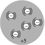 Il modello di Thomson chiamato Plum-Pudding nel caso di 5 elettroni. La parte grigia è carica di elettricità positiva equivalente a quella dei 5 elettroni.