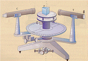 Per portare avanti le loro ricerche Kirchhoff e Bunsen si servirono di uno spettroscopio, strumento da loro realizzato e costruito da K. A. von Steinheil (famoso costruttore di strumenti ottici) nel 1853. Sulla destra della figura seguente vi è una fenditura regolabile in ampiezza da cui far passare la luce. La luce può essere quella di una lampada (luce bianca) o quella ottenuta con un becco Bunsen sul quale è sistemata una retina metallica sulla quale si mettono delle sostanze che si fanno bruciare per vederne gli spettri. Questa “luce” passa attraverso il collimatore T, va sul prisma P dove viene separata, quindi entra nel cannocchiale C (mobile su una ghiera graduata) ai cui estremi vi è un osservatore o una lastra fotografica (al posto di P, per avere immagini più sofisticate si possono sistemare dei reticoli di diffrazione).