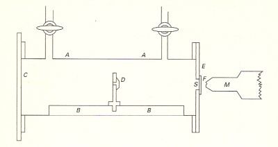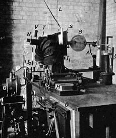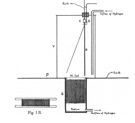 Apparato utilizzato da Rutherford per mostrare che anche le particelle α subivano deviazioni se i campi magnetici erano sufficientemente intensi. Le radiazioni provenienti da un sottile strato di radio passavano attraverso il sistema di fenditure realizzato disponendo, parallelamente l’una all’altra, un determinato numero di lastre d’ottone. Passando poi attraverso un sottile foglio di alluminio (spesso 0,00034 cm) entravano nella camera di ionizzazione V. La ionizzazione prodotta era misurata determinando la velocità di scarica dell’elettroscopio B. Il flusso di idrogeno, che dal recipiente V passava attraverso il foglio di alluminio poroso nel recipiente G, aveva un duplice scopo: per un verso serviva a portar via l’emanazione del radio, per l’altro verso serviva ad aumentare la corrente di ionizzazione dovuta ai raggi α e a diminuire quella dovuta ai raggi β e γ. Ciò era dovuto al fatto che i raggi α erano poco assorbiti dall’idrogeno rispetto all’aria, mentre i raggi β e γ producevano, in idrogeno, una quantità molto minore di ioni rispetto a quella prodotta in aria. L’esperienza, nelle sue linee generali, consisteva nel misurare la corrente di ionizzazione con e senza l’applicazione di un forte campo magnetico, perpendicolare al piano del disegno e parallelo al piano delle fenditure. La valutazione degli effetti di ionizzazione, non determinati dai raggi α, era eseguita ripetendo la stessa esperienza, quando la sorgente radioattiva era ricoperta da un foglio di mica in modo da assorbire tutte le radiazioni α.