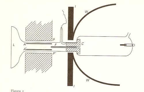 Le misure di e/m per i raggi positivi di Thomson si realizzarono con l’apparato di figura seguente, che è una modifica dell’originale di Goldstein mostrato nella figura precedente.