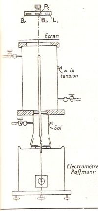 Strumento inizialmente utilizzato da Maria Curie per misurare la ionizzazione dell’aria prodotta dai raggi uranici. L’elettroscopio, caricato precedentemente, si scarica se tra i piatti di un condensatore poniamo una sostanza radioattiva che, ionizzando l’aria, la rende conduttrice. La scarica dell’elettroscopio è tanto più rapida quanto più intensa è la radiazione ionizzante.