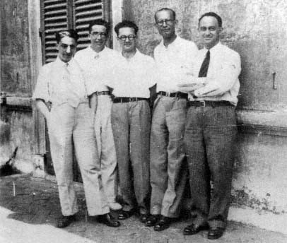 Da sinistra: D’Agostino, Segrè, Amaldi, Rasetti, Fermi. La foto fu scattata dal più piccolo del gruppo, Pontecorvo.