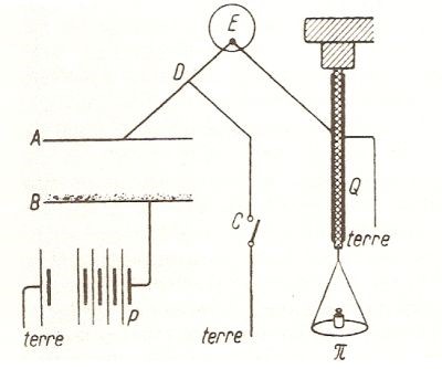 Strumento realizzato da Pierre Curie insieme al fratello Jacques per misurare correnti molto deboli. E’ simile al precedente ma qui si utilizza un sistema più perfezionato e preciso per misurare la corrente sviluppata dalla sostanza radioattiva disposta sul piatto B del condensatore alimentato da una batteria P di pile. Si tratta di un elettrometro a quarzo. L’elettrometro è quello indicato con E, π rappresenta i pesi disposti sul piattello, mentre Q è un quarzo piezoelettrico la cui fenomenologia era stata scoperta proprio dai fratelli Curie nel 1880 (in breve: alcuni cristalli, tra cui il quarzo, si deformano elasticamente se sottoposti ad un campo elettrico). Nelle esperienze di Curie le placche erano del diametro di 8 cm e distanti tra loro 3cm. Veniva utilizzata una tensione V di circa 100 volt che forniva una corrente I dell’ordine di 10-12A.