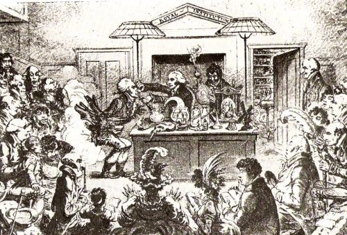 Un disegno caricaturale di una lezione sperimentale alla Royal Institution. Sulla destra, in piedi, è riprodotta la figura di Rumford.